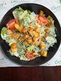 Diced breaded chicken cutlet, bacon bits, mozzarella cheese drizzled with ranch dressing and sprinkled with parsley garnish.